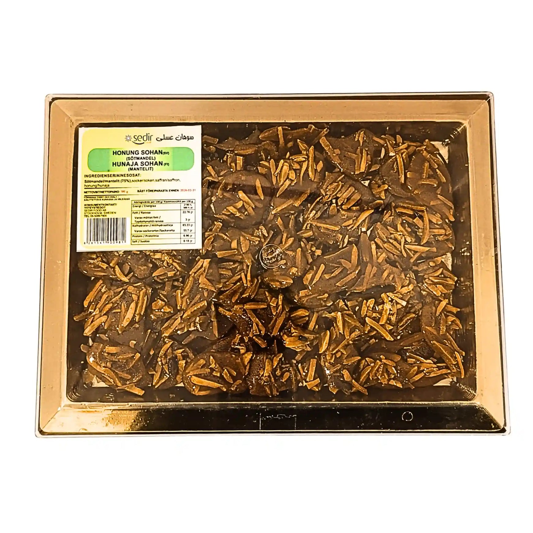 Sohan Asali Sedir 300g är en läcker och aromatisk iransk godbit som kombinerar den naturliga sötman från honung med rostad sötmandel och saffran. Sohan är en traditionell iransk dessert, känd för sin krispiga konsistens och rika smak. Denna variant med honung (Asali) ger en extra dimension av sötma och fyllighet, vilket gör den ännu mer utsökt och välsmakande.