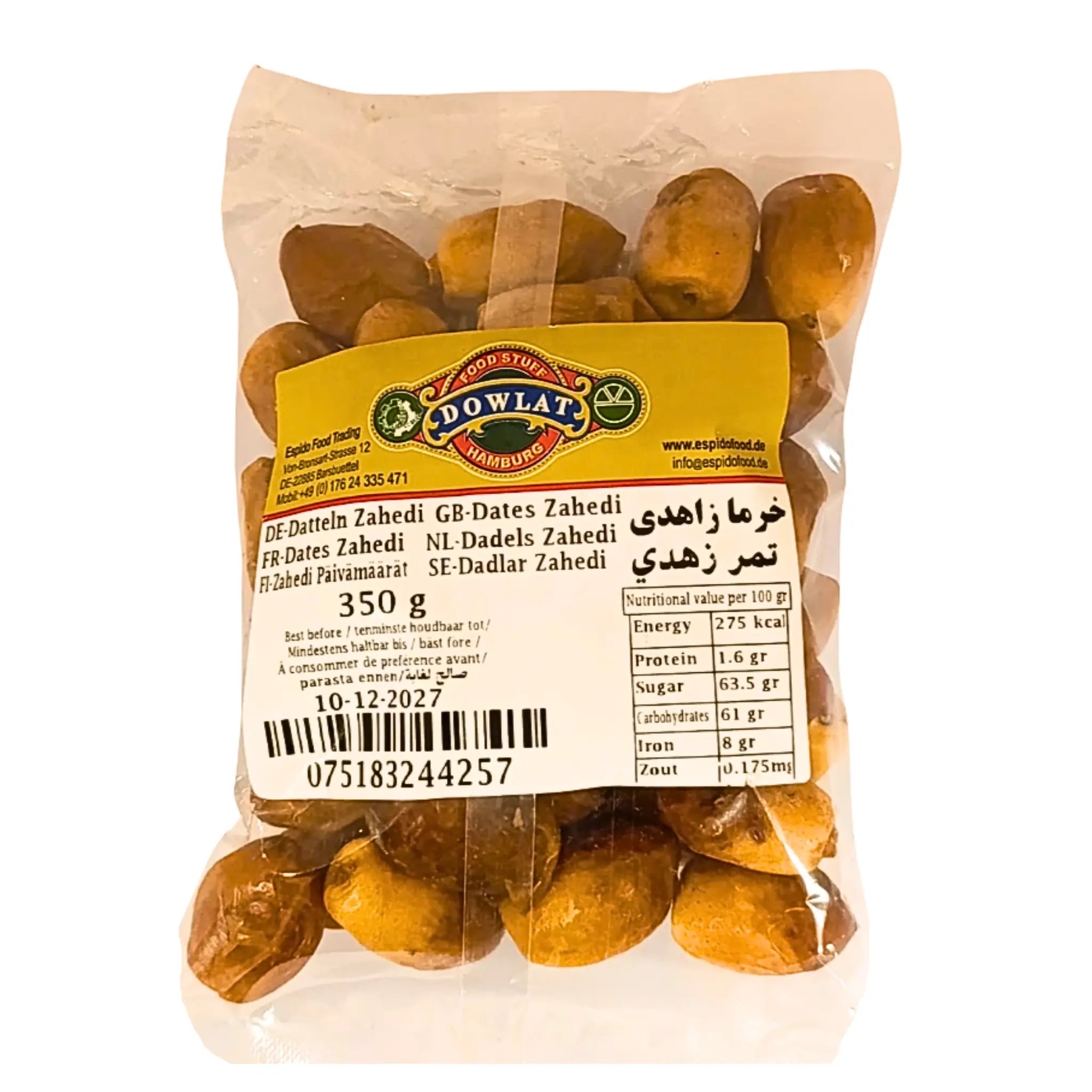 Iranska Zahedi Dadlar Dowlat 350g är en utsökt och naturligt söt delikatess från Iran. Dessa gyllenbruna dadlar har en fastare konsistens och en mild, karamellaktig smak som gör dem perfekta som ett hälsosamt mellanmål eller som en naturlig sötning i bakverk och maträtter. Rika på fibrer, vitaminer och mineraler, erbjuder de både näring och energi. Njut av dem precis som de är eller kombinera med nötter och ost för en lyxig smakupplevelse!